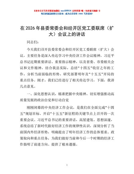 / 在2026年县委常委会和经开区党工委联席(扩大)会议上的讲话