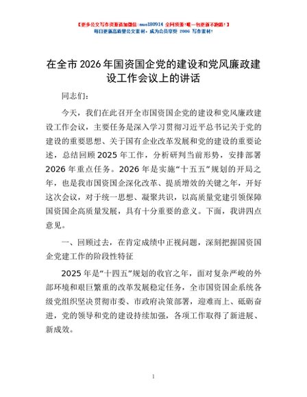 / 在全市2026年国资国企党的建设和党风廉政建设工作会议上的讲话