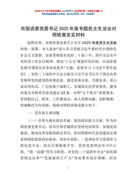 / 市国资委党委书记2025年度专题民主生活会对照检查发言材料
