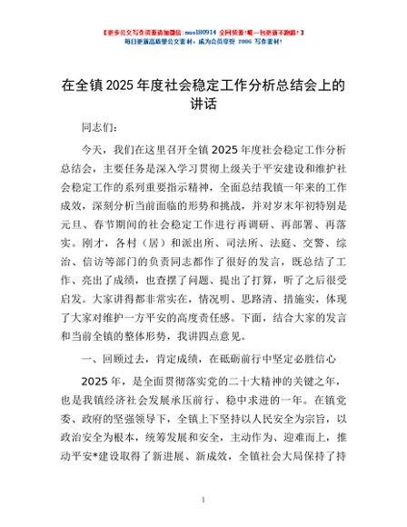 / 在全镇2025年度社会稳定工作分析总结会上的讲话