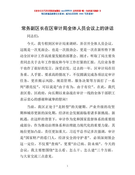 / 常务副区长在区审计局全体人员会议上的讲话