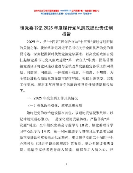/ 镇党委书记2025年度履行党风廉政建设责任制报告