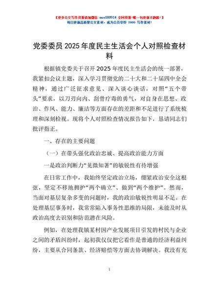 / 党委委员2025年度民主生活会个人对照检查材料