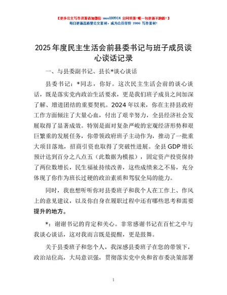 2025年度民主生活会前县委书记与班子成员谈心谈话记录
