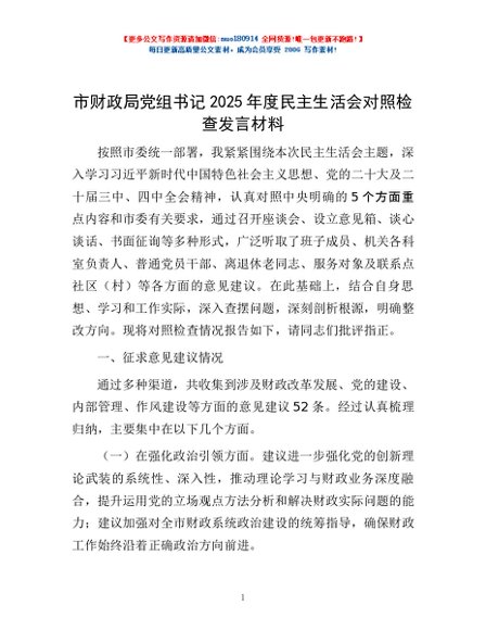 / 市财政局党组书记2025年度民主生活会对照检查发言材料