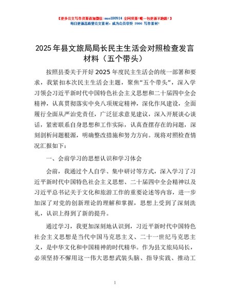 / 2025年县文旅局局长民主生活会对照检查发言材料(五个带头)