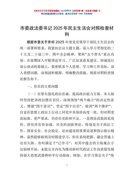 / 市委政法委书记2025年民主生活会对照检查材料
