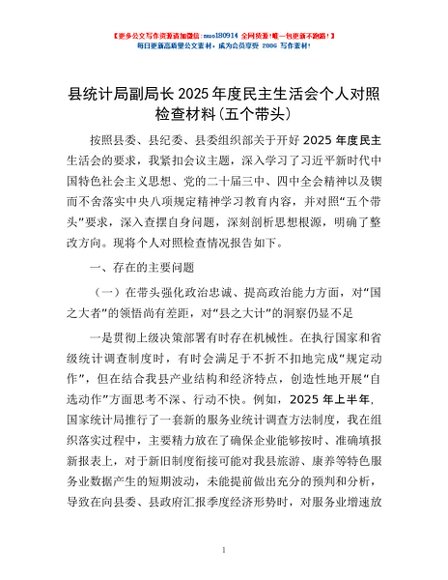 / 县统计局副局长2025年度民主生活会个人对照检查材料(五个带头)
