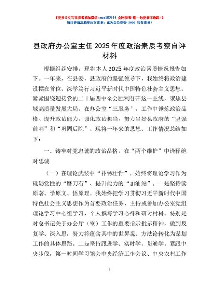 / 县政府办公室主任2025年度政治素质考察自评材料