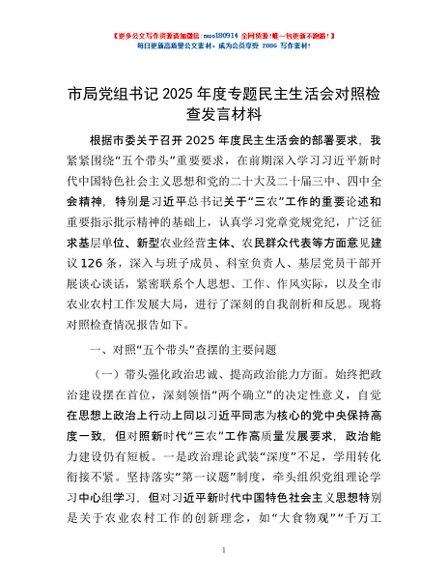 / 市局党组书记2025年度专题民主生活会对照检查发言材料