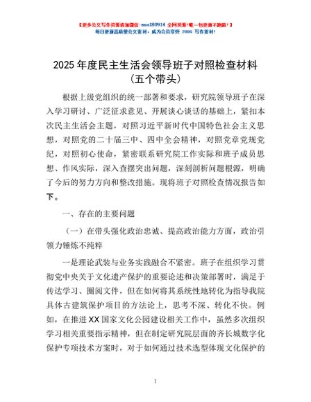 / 2025年度民主生活会领导班子对照检查材料(五个带头)