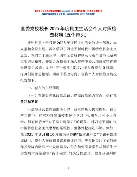 / 县委党校校长2025年度民主生活会个人对照检查材料(五个带头)