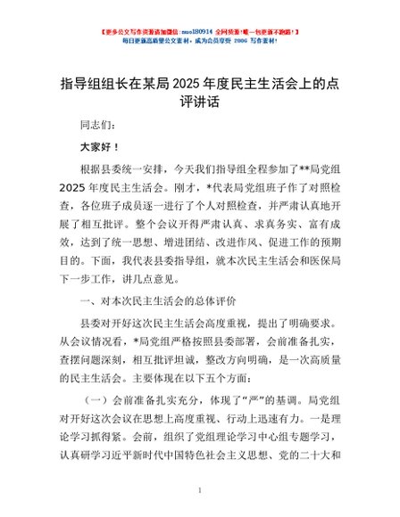 / 指导组组长在某局2025年度民主生活会上的点评讲话