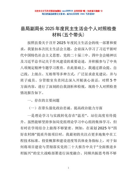 / 县局副局长2025年度民主生活会个人对照检查材料(五个带头)