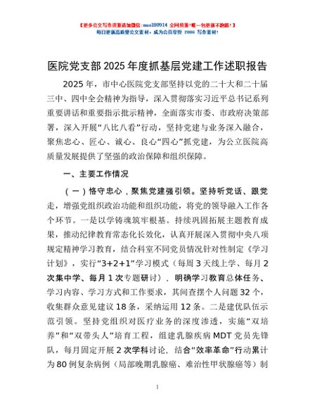 / 医院党支部2025年度抓基层党建工作述职报告