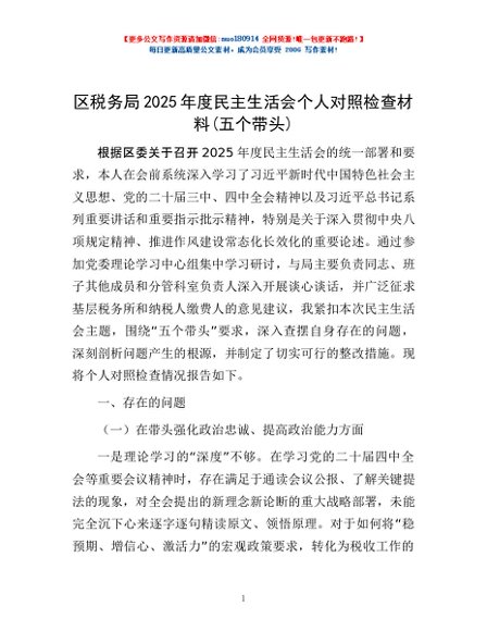 / 区税务局2025年度民主生活会个人对照检查材料(五个带头)