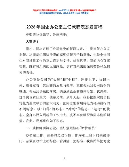 / 2026年国企办公室主任就职表态发言稿