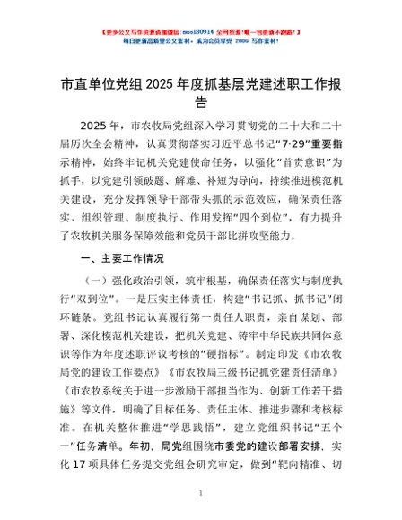 / 市直单位党组2025年度抓基层党建述职工作报告