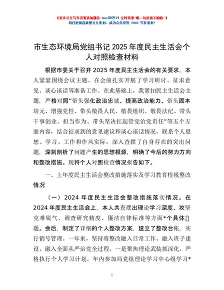 / 市生态环境局党组书记2025年度民主生活会个人对照检查材料