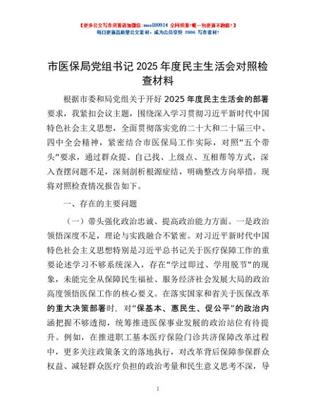 / 市医保局党组书记2025年度民主生活会对照检查材料