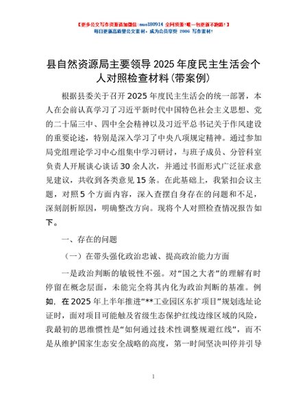/ 县自然资源局主要领导2025年度民主生活会个人对照检查材料(带案例)
