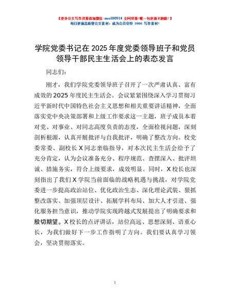 / 学院党委书记在2025年度党委领导班子和党员领导干部民主生活会上的表态发言
