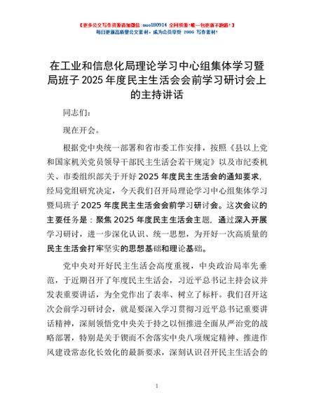 / 在工业和信息化局理论学习中心组集体学习暨局班子2025年度民主生活会会前学习研讨会上的主持讲话