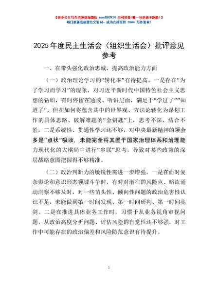 / 2025年度民主生活会(组织生活会)批评意见参考
