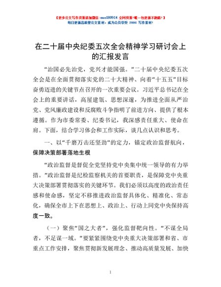 / 在二十届中央纪委五次全会精神学习研讨会上的汇报发言