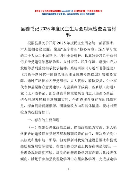 / 县委书记2025年度民主生活会对照检查发言材料