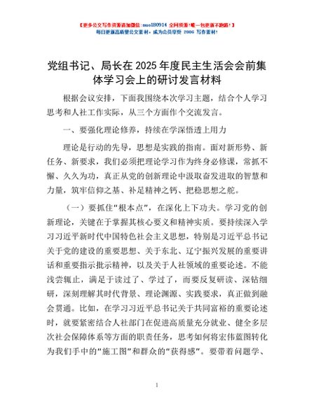/ 党组书记、局长在2025年度民主生活会会前集体学习会上的研讨发言材料