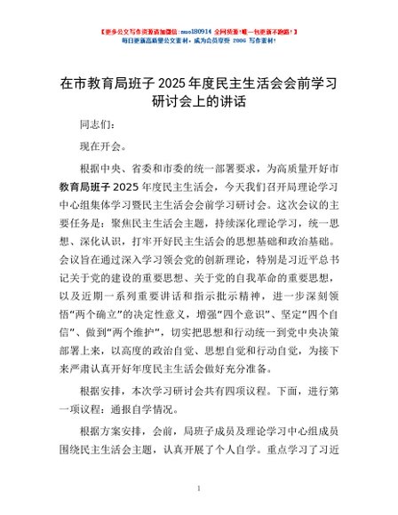 / 在市教育局班子2025年度民主生活会会前学习研讨会上的讲话