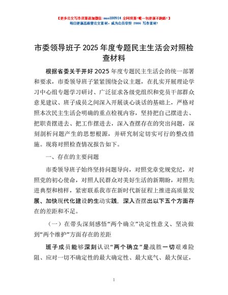 / 市委领导班子2025年度专题民主生活会对照检查材料