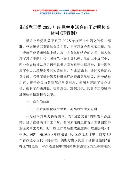 / 街道党工委2025年度民主生活会班子对照检查材料(带案例)