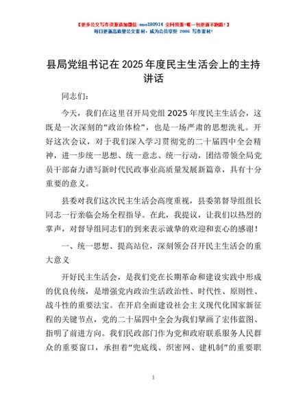 / 县局党组书记在2025年度民主生活会上的主持讲话
