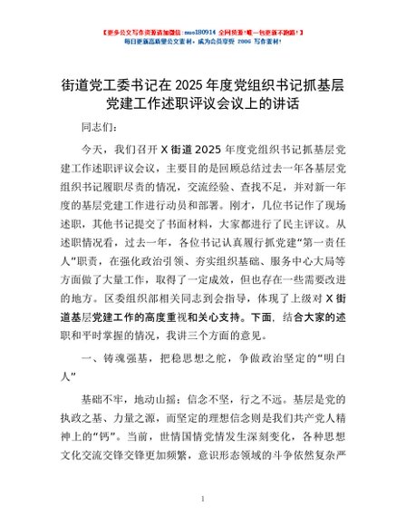 / 街道党工委书记在2025年度党组织书记抓基层党建工作述职评议会议上的讲话