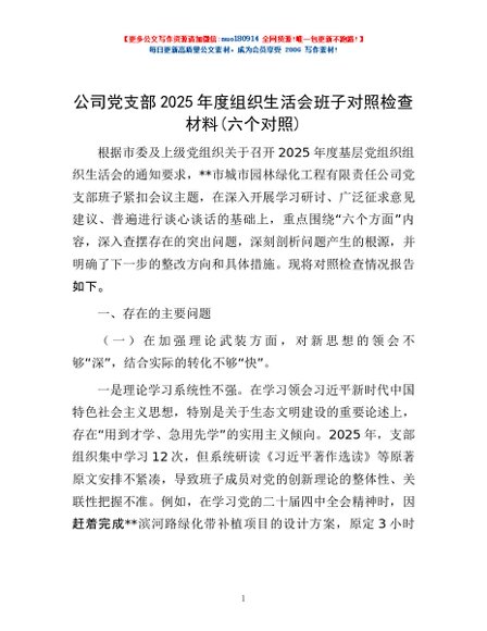 / 公司党支部2025年度组织生活会班子对照检查材料(六个对照)