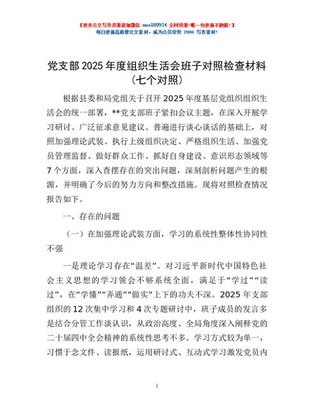 / 党支部2025年度组织生活会班子对照检查材料(七个对照)