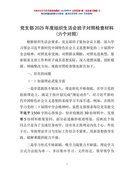 / 党支部2025年度组织生活会班子对照检查材料(六个对照)
