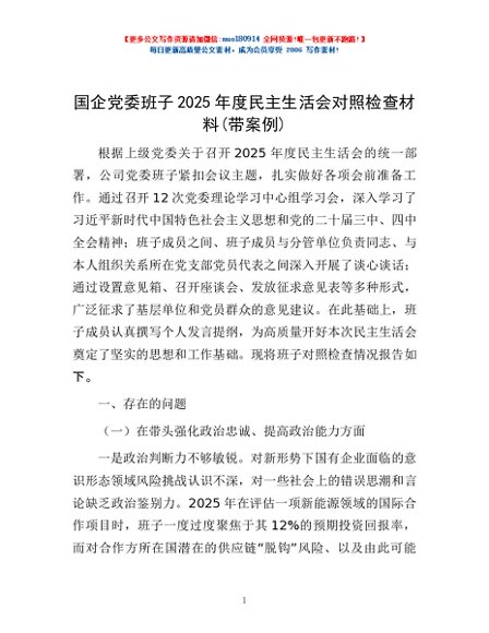 / 国企党委班子2025年度民主生活会对照检查材料(带案例)