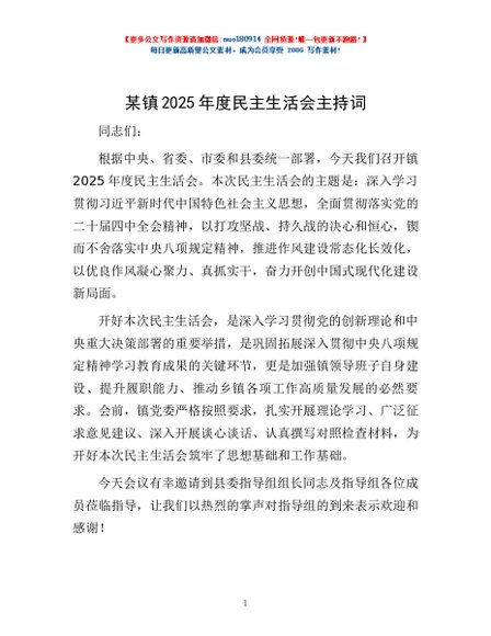 / 某镇2025年度民主生活会主持词