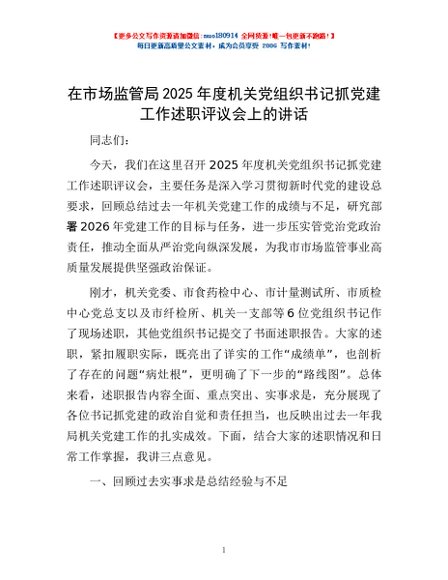 / 在市场监管局2025年度机关党组织书记抓党建工作述职评议会上的讲话