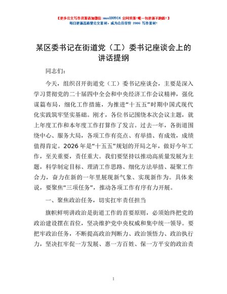 / 某区委书记在街道党(工)委书记座谈会上的讲话提纲