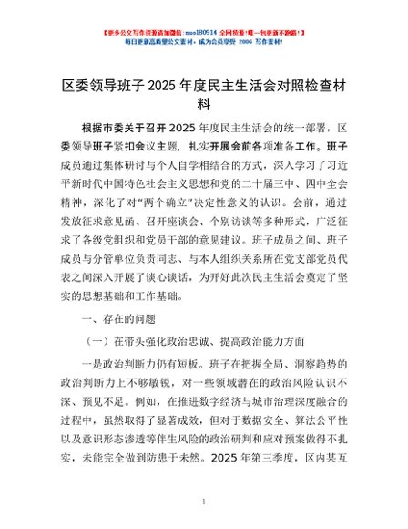/ 区委领导班子2025年度民主生活会对照检查材料