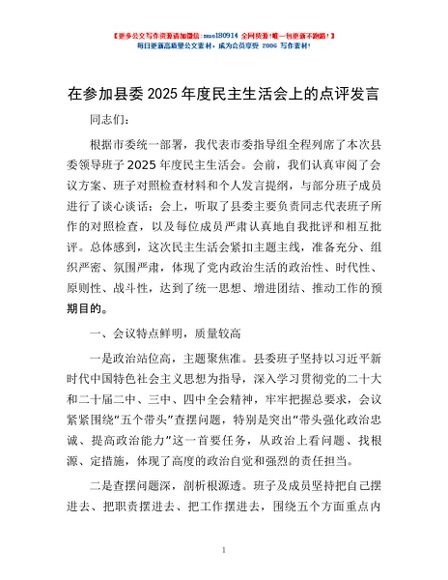 / 在参加县委2025年度民主生活会上的点评发言