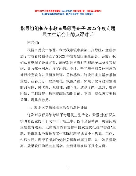 / 指导组组长在市教育局领导班子2025年度专题民主生活会上的点评讲话