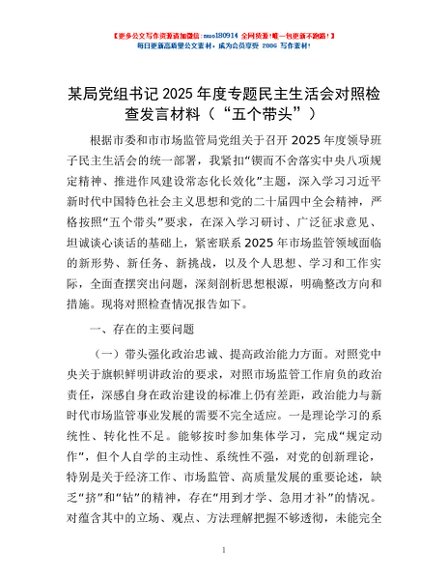 / 某局党组书记2025年度专题民主生活会对照检查发言材料(“五个带头”)
