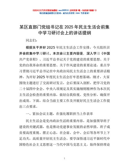 / 某区直部门党组书记在2025年民主生活会前集中学习研讨会上的讲话提纲