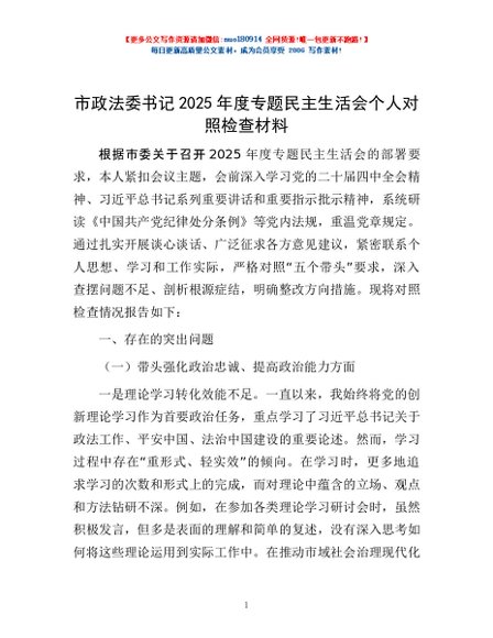 / 市政法委书记2025年度专题民主生活会个人对照检查材料