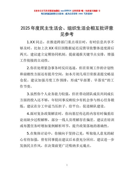/ 2025年度民主生活会、组织生活会相互批评意见参考